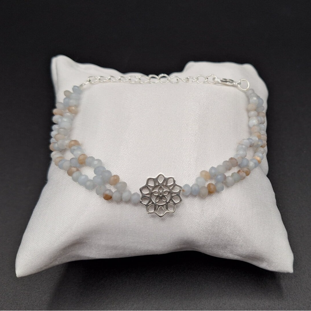 1 Armband aus 4 mm großen, facettierten Angelit - Perlen und silbernem Mandala in einer dekorativen Schmuckschachtel, 1 Karte zu Wirkung und Pflege